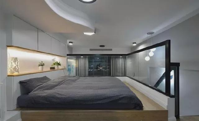 最爱的还是二楼的卧室,透明的玻璃护栏能让一楼的光线很好的传达到卧室,还能让卧室显得宽敞很多。像这种小户型loft公寓,空间面积是有限的,所以舍弃了厚重又占地的实木床,直接把地面抬高一截,做成地台床,节省空间不说,睡眠环境也更为轻松舒适。床头还打了一排储物柜,用来增加卧室的收纳,暖黄色的灯带,把居室氛围渲染的很温馨。