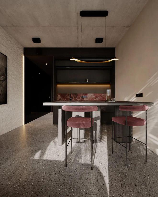 由 Bodes Studio 设计的切马吉公寓,把 “克制的高级” 玩到极致!炭黑墙面 + 抛光混凝土地面打底,酒红大理石、暗红点缀穿插其中,每一处都像电影帧一样有故事感,光影流动间全是氛围感️