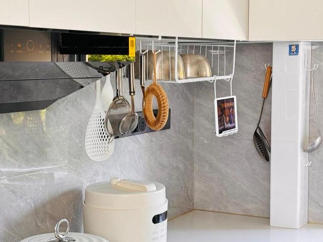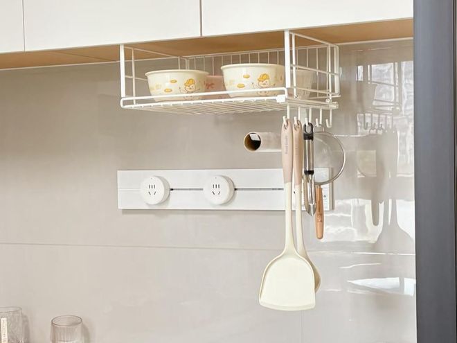 厨房挂篮只需要在橱柜的层板下面安装,悬挂式的收纳栏可以挂在层板上,也可以粘在上面。不会占用台面的任何空间,而且创造出不错的收纳空间。