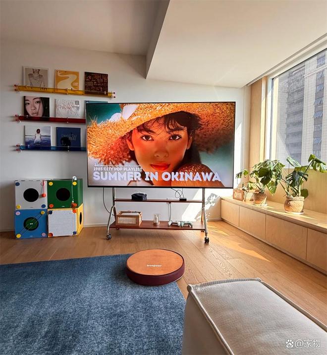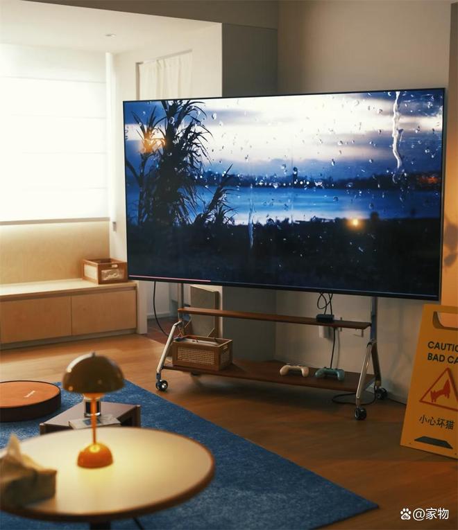 不做电视柜的设计是真的很灵活,即便是85吋的电视,也可以通过这带滚轮的支架随意移动,既节省了空间,让竖厅视觉上显得大了不少,又能妥善放置电视,并通过底板架收纳机顶盒、游戏机等物,一举两得。