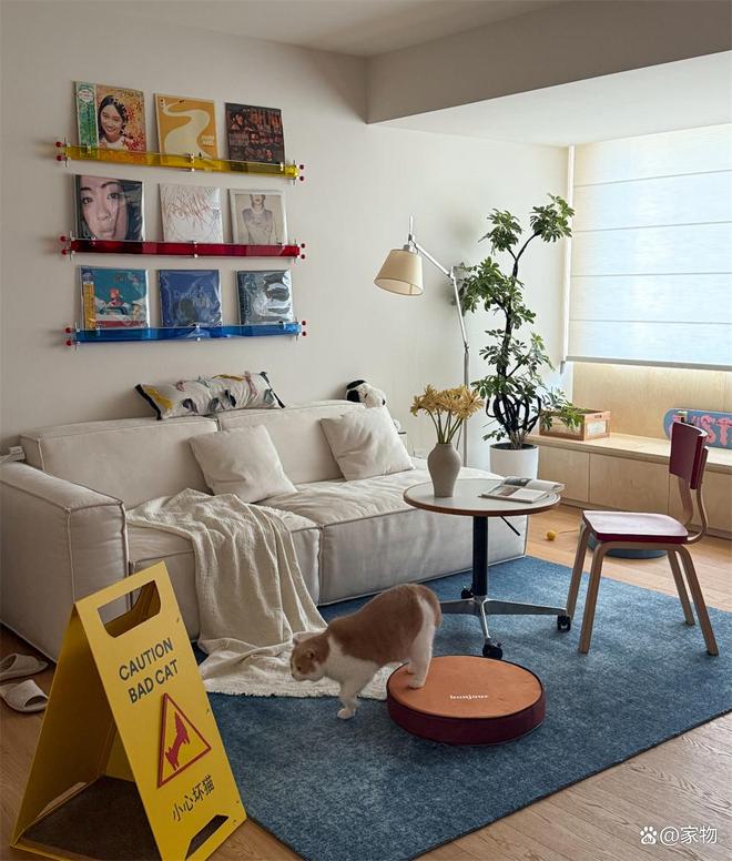 家里原本有一间小小的阳台,但现在完全和客厅打通,并用矮柜架起了一个“假地台”,底部做柜格当作收纳柜,上面则相当于是飘窗休闲区,增加了客厅的落座空间,同时也有一个喝下午茶的地方。