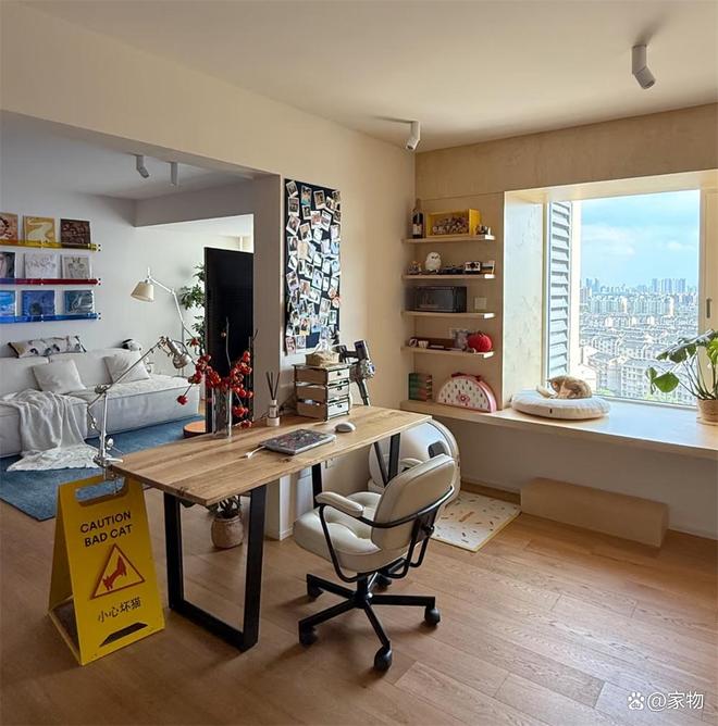 家里原本的电视墙,现在被切分出一半,将其与书房打通,而书房则顺势做成了开放式格局,书桌就放在如今打通的半墙处,坐在这里办公的时候,客厅场景可以尽收眼底,想来也是挺惬意的啦~