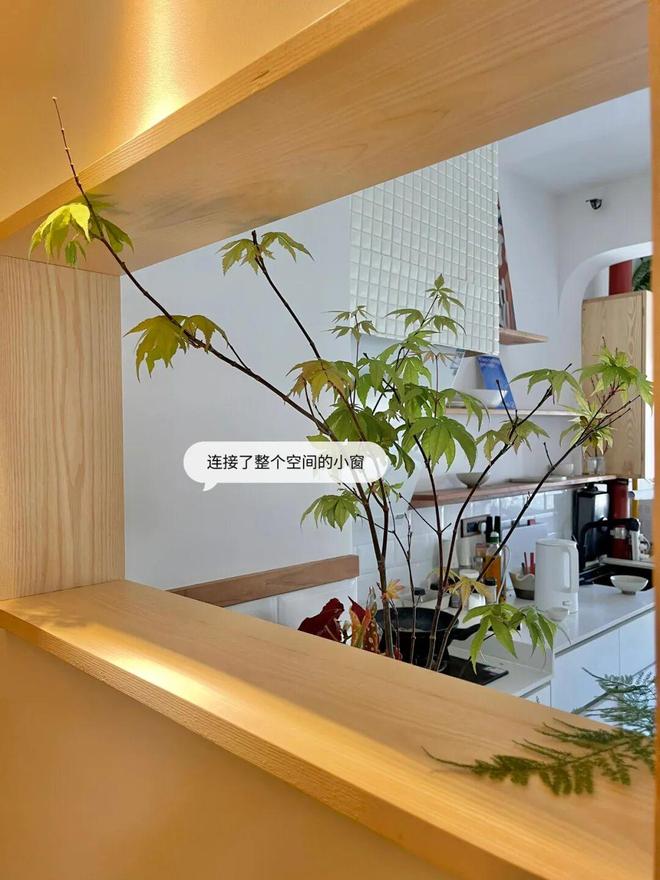 再比如给餐厨区的墙体开个窗,除了可以让空间更通透之外,还兼具了互动、吧台、传菜等多种功能。