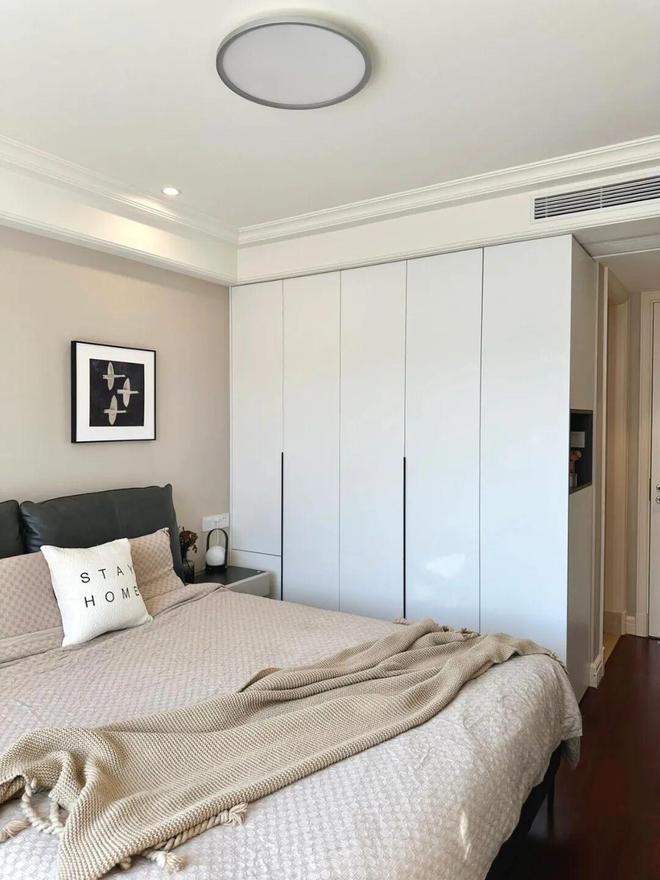 传统的卧室衣柜,一般都会设计在床头一侧,保证床尾有充足的动线空间,以及方便预留电视机位置。