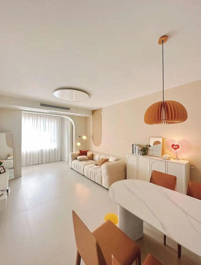 可能有的人会说,我家里层高有限,但又必须做满吊顶处理该怎么办呢?其实,我们可以在满吊顶的基础上,在房梁位置做一个弧形连接处理,从而产生一种自然连续的视觉感。