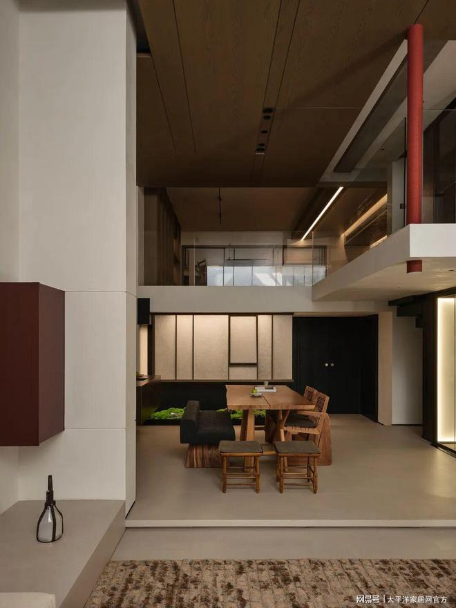 夹层下方用模块沙发围合成下沉式多功能休闲区,与侧面的木质茶桌构成静谧的茶叙角落,围合出亲切的尺度感。