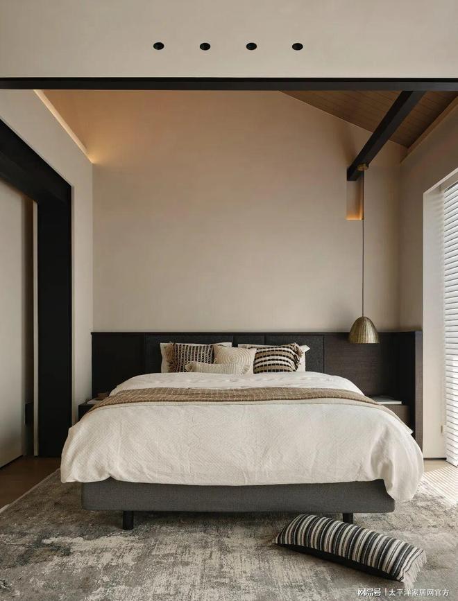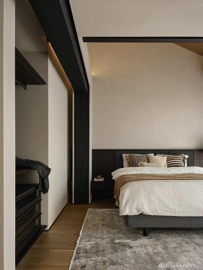 主卧床边的黑色梁柱并非炫技,而是通过结构改造,让原本逼仄的卧室空间有了更舒适的尺度。