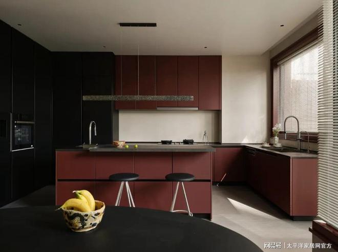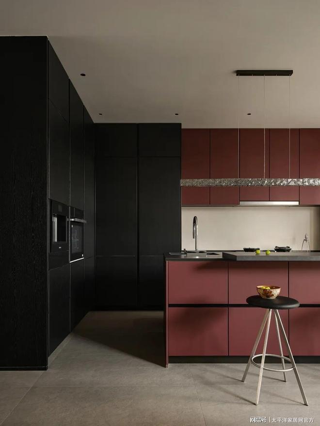 红黑色橱柜与金属质感吊灯形成冷暖碰撞,赋予空间视觉张力,橱柜拉手隐藏于精密开缝之中,触手顺滑无阻,细节尽显对工艺的极致追求。