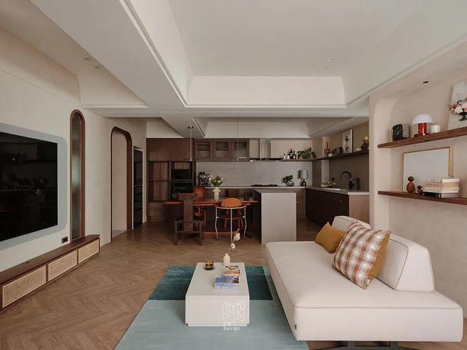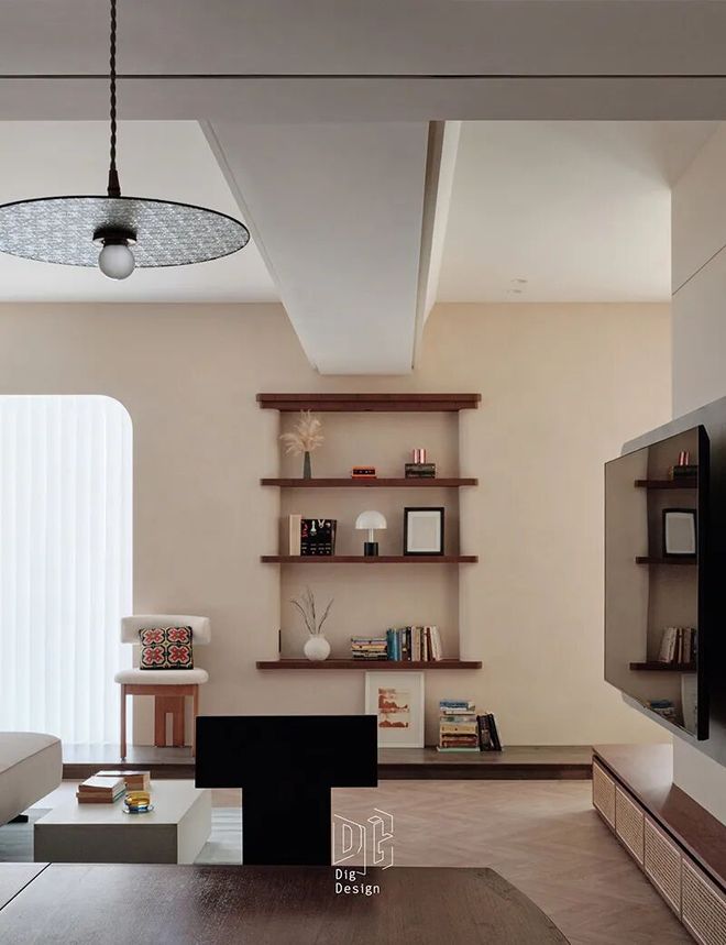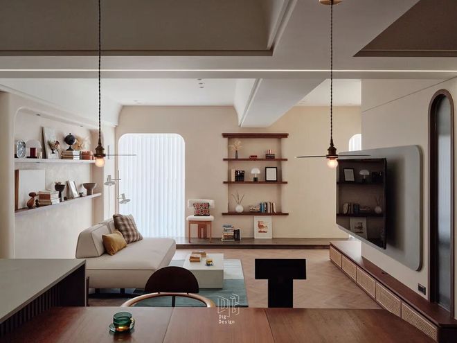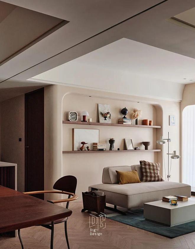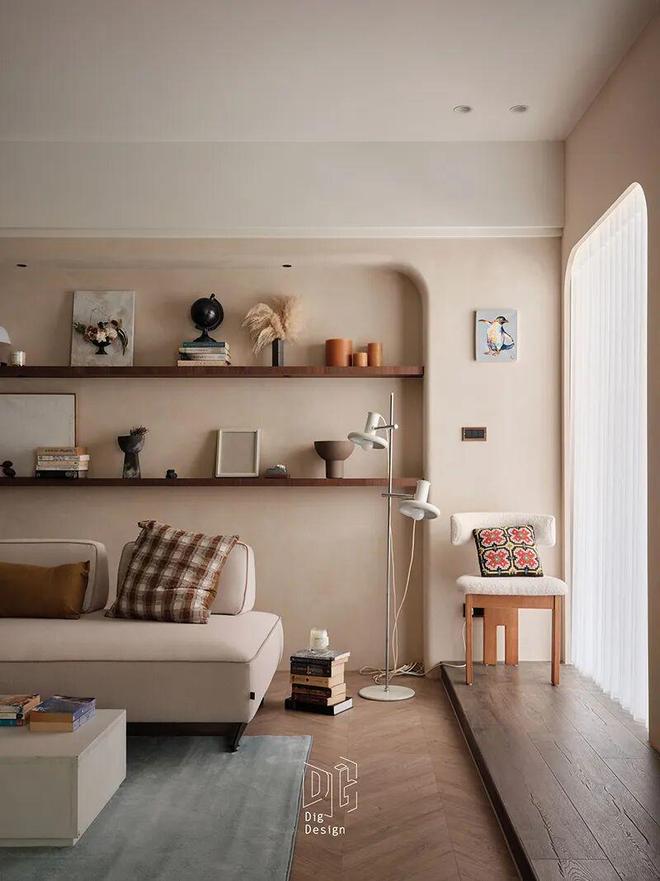 沙发背墙以壁龕样式,与侧边落地窗互为烘托