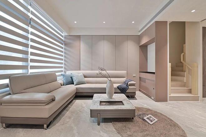 与两侧奶茶色调的柜面、 L 形阔面沙发搭配