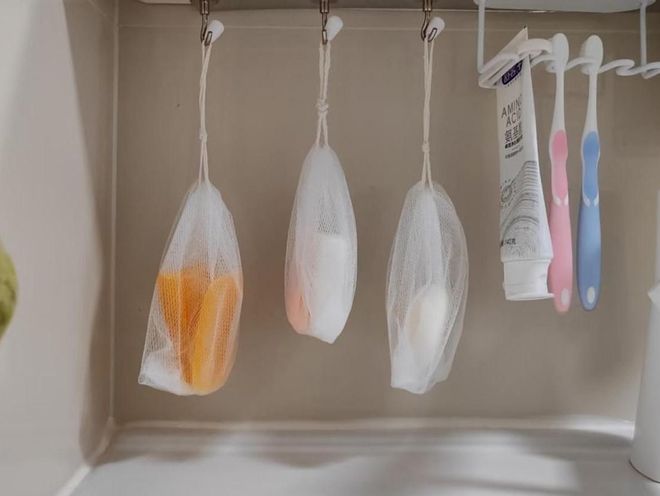 相信很多人家里都有各种各样的丝袜,只要挑选一个结实的丝袜,洗干净晾晒干。然后,剪下来一段,将肥皂装进去,带口用绳子扎上就可以了,也可以悬挂在台面上面。