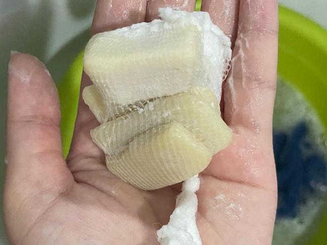 由于丝袜本身具有很密的网孔结构,所以肥皂放在里面是不会露出来。但是,它的通风排水效果却很好,肥皂很快就干了,而且更利于起沫,也更好用了。