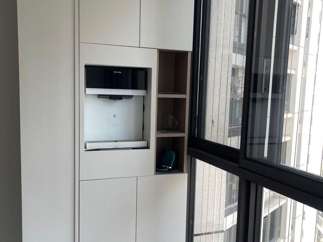 管线机的薄柜子,让视觉更整洁,所有的管线都暗藏,墙面也干净利落。关键的是可以增加收纳,收纳杯子,茶叶,纸巾等用品都可以。还能够防止孩子直接接触管线机,避免带来危险。