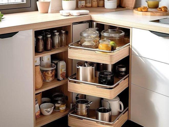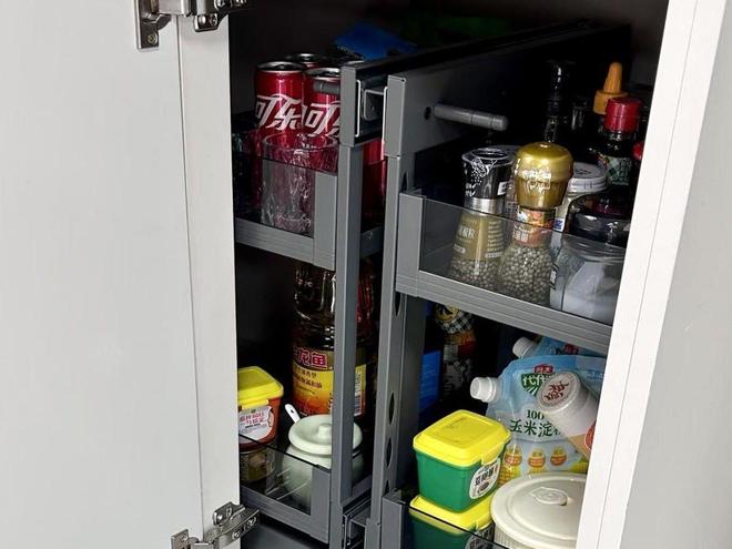 现在有越来越多人坚持做的一个收纳,就是厨房的转角拉篮。可以说,是完美化解墙角的尴尬。