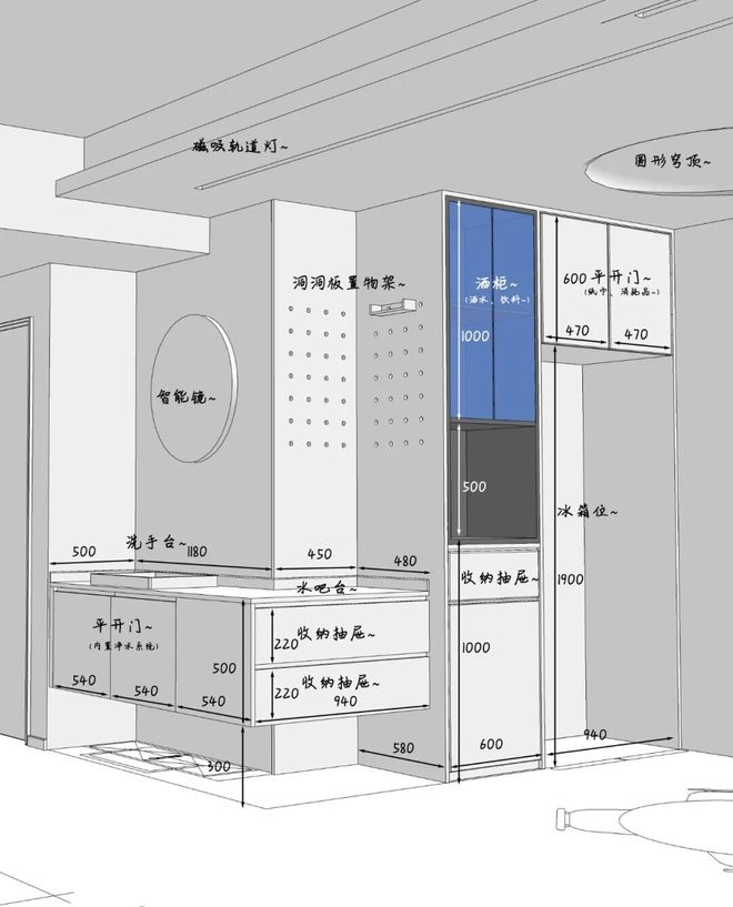 台面设计:1165cm洗手区 + 950cm水吧台(可放咖啡机/饮水机)