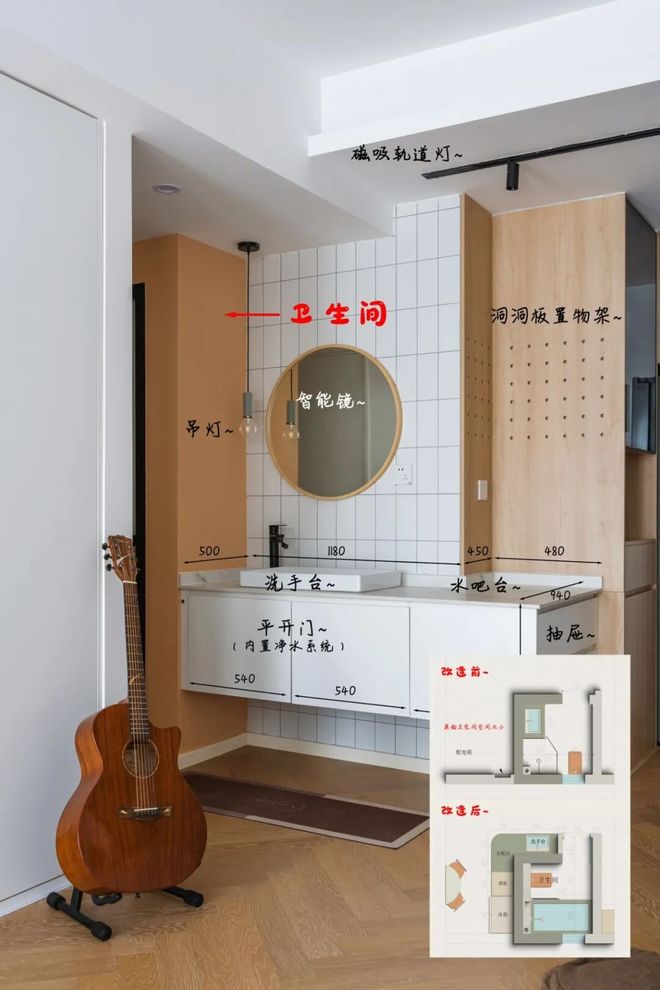 项目背景:这次改造的卫生间太小,传统干湿分离根本塞不下洗手台。