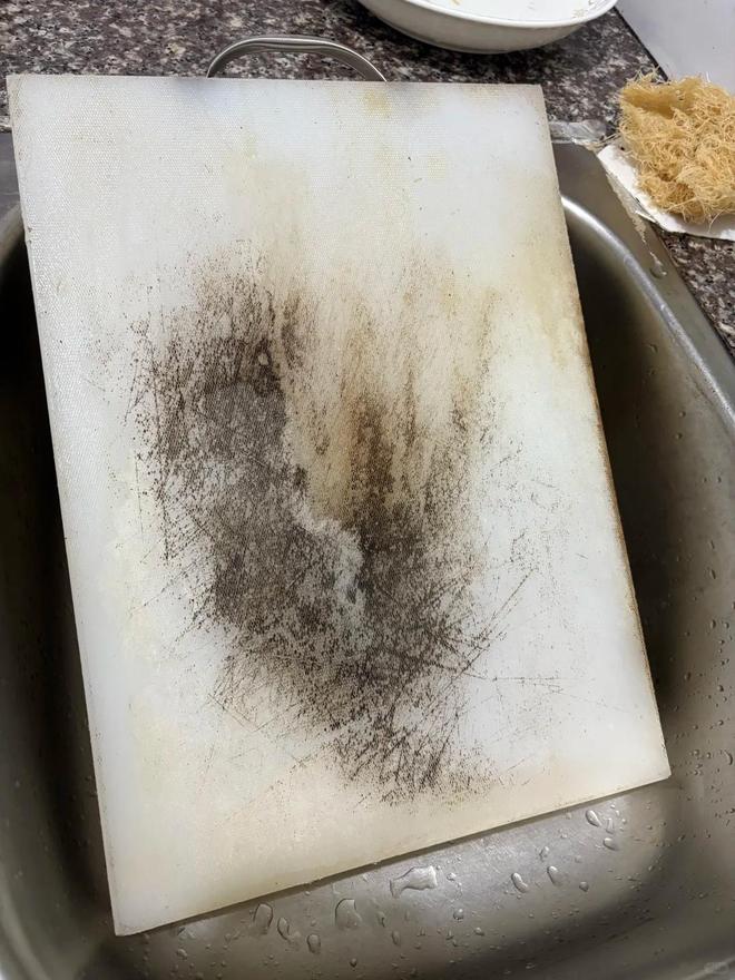 网友@丽丽家的莉莉:我家那块菜板切久了发黄,拿去泡热水一看,水面全是油花和小碎屑,恶心得我立马扔。
