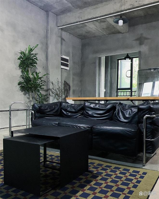 在餐桌前面放沙发和茶几,你别说,这黑色的沙发和茶几相互搭配,和家里的水泥风装修还真是格外搭配。