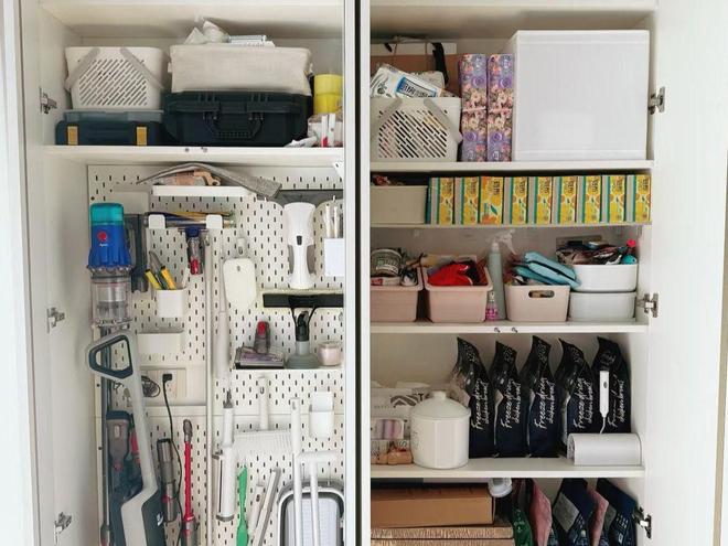 只需要在阳台的一面墙上,例如侧墙定制通顶家政柜。内部一般可以配置洞洞板,挂钩,部分层板。就是这一个小小的柜子,几乎可以将家里的清洁工具收纳殆尽。