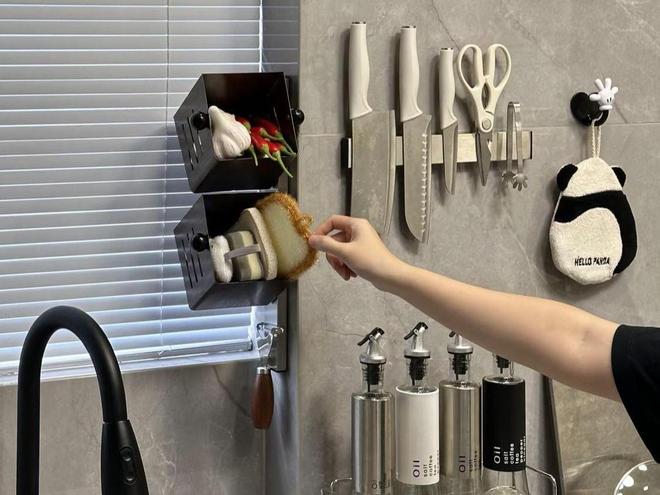 磁吸收纳,可以让我们的厨房台面得到解放,让操作台面更整洁,显得更宽敞。最为重要的是,由于是垂直悬挂,可以加速水分蒸发,避免滋生了细菌。