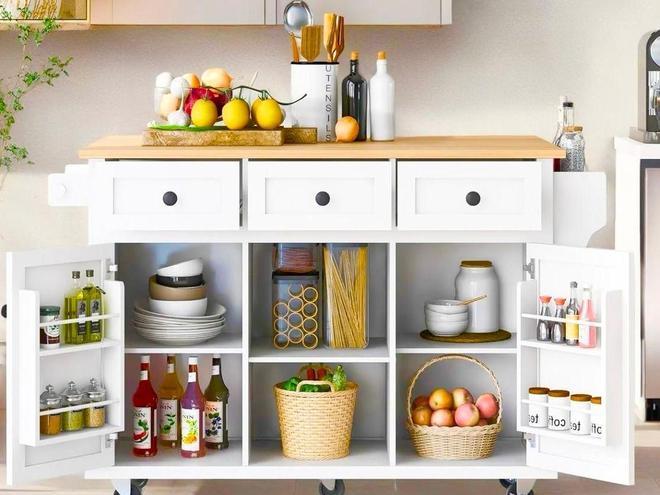做法也非常简单,只需要定制一个带有万向轮的多层移动岛台。上层可以作为操作区、置物区,中层装上抽屉,下层可以作为开放式储物区。