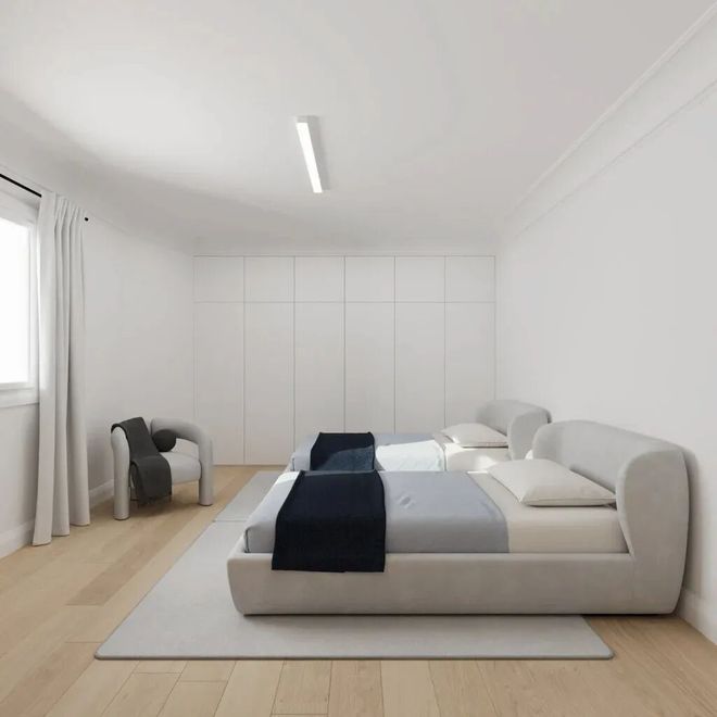 4.卧室:软包床头板 + 球形灯具太绝了!原木地板增添温暖,窗边书桌秒变宁静工作区,连梳妆角都摆着鲜花,细节满溢