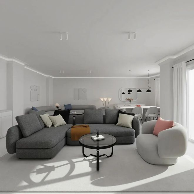 客厅:雕塑感灰色沙发 + 利落黑咖啡桌,再用 muted 蓝、粉红、赭石色小点缀提亮,现代感拉满还不冰冷