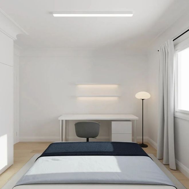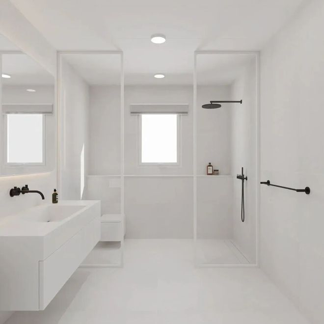 5.浴室:纯白哑光饰面 + 黑色五金,悬浮盥洗台 + 背光镜显通透,圆形元素中和冷硬,清新又精致