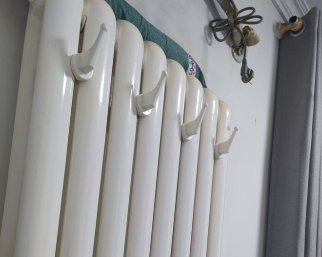 最后,自然是可以利用暖气片,加装几个挂钩当作小衣帽架啦,无论是玄关、卧室还是老户型客厅位置的暖气片,都可以安装上几个这类挂钩,同时起到挂衣和烘暖的作用,外套挂在这上面,出门穿的时候都是暖暖的~