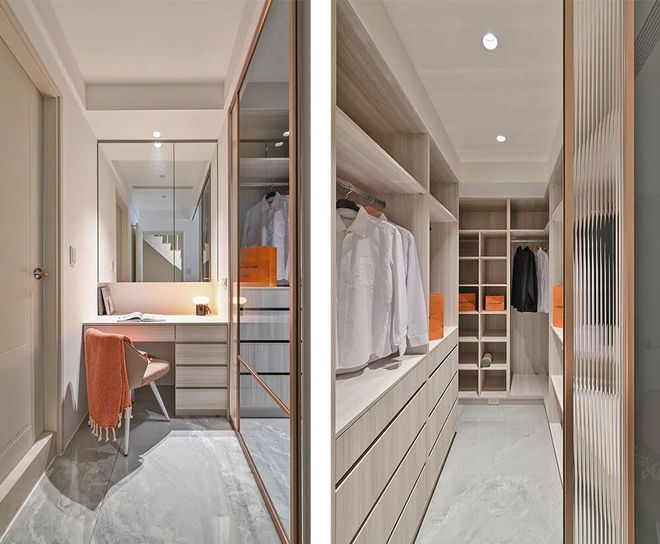 以暖系木质勾勒床背板,并形塑一座单侧衣柜