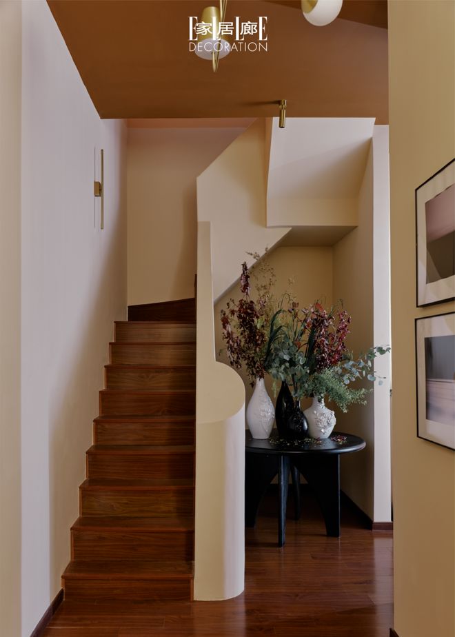 餐厅与客厅之间,以收藏多年的树根雕塑为边界,隔而不断,自然衔接。与此同时,餐厅一侧和楼梯之间的“鸡肋”区域,也因为设计师家具和墙镜的设置,变得灵动有效了起来。