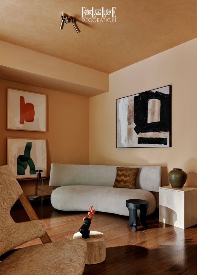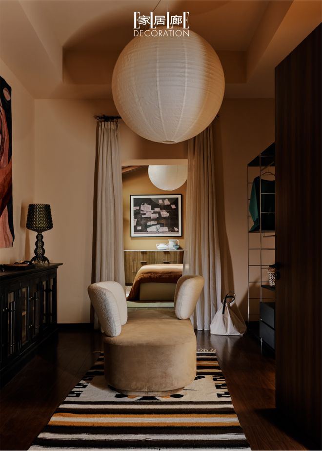 穿过树木林立的小径,走进Heddy家,“色彩、质感、碰撞”等等独特个人设计语言,以一种更为柔软与平和的方式呈现于眼前,天顶、墙面、家具、灯光.....各种媒介和细节,以温暖的古铜大地色系为主调,用不同的形式和质感自然融合,展现出其设计语言中所贯彻的生机勃勃,但又更为醇厚和温柔。舍弃了玄关的客厅,以两处不同形态的沙发自然围合,构筑起整体舒适自在的社交场域。