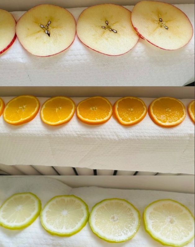 没错,甚至还可以利用暖气片来自制蔬果干,一般情况下,我觉得最方便的就是柠檬、橙子和苹果,切成薄片再垫上张洗脸巾,就可以在上面进行烘干,最终变成果干,泡水喝真的特别棒,而且完全干透后也不用担心变质。