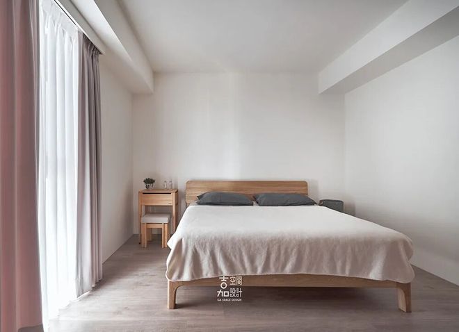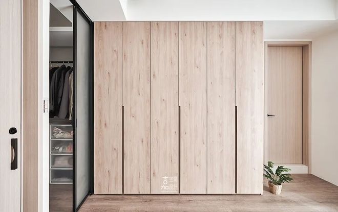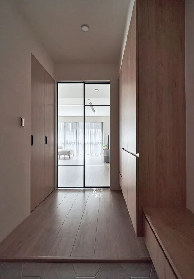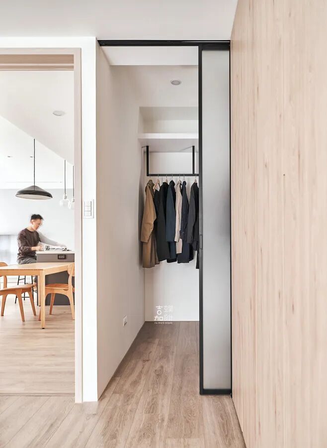 更衣室与主卧之间的区隔,选用喷砂玻璃拉门