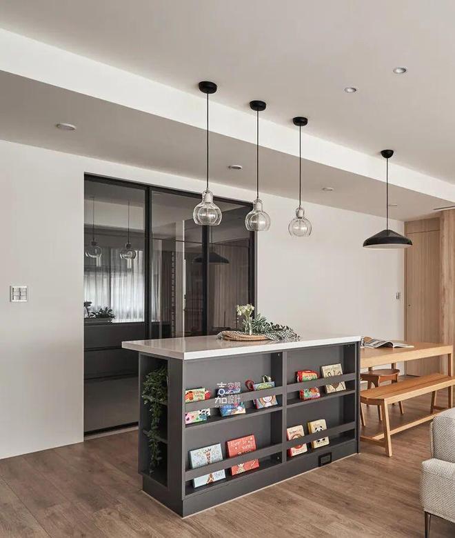 中岛侧边更贴心设计了可供放置童书的开放书架