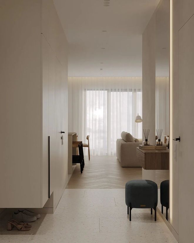 水磨石地面带着细腻的温度,踩上去暖暖的~ 悬浮玄关柜 + 天鹅绒矮凳,随手放包换鞋,仪式感拉满!整个空间安安静静的,瞬间卸下外界的浮躁,这才是回家的正确打开方式呀~