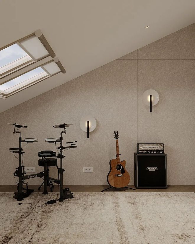 倾斜天花板下的小空间也太绝了!鼓、吉他 + 白色钢琴,是音乐室也是休闲角~ 中性色调保持了宁静感,天窗洒下的日光随时间流转,光影斑驳间,灵感自然来~ 极简沙发 + 暖调地毯,创作累了就躺平,幸福感爆棚!