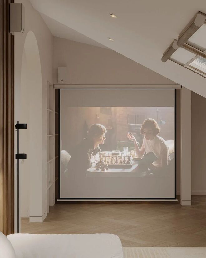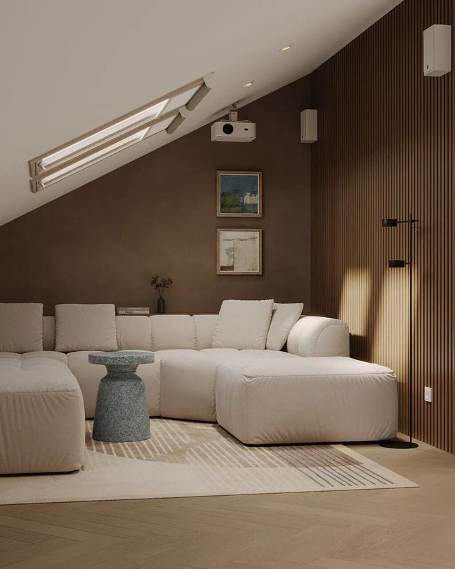 谁能拒绝阁楼影院啊!灰褐色墙壁 + 垂直木格栅,氛围直接拉满~ 蓬松组合沙发怎么躺都舒服,白天晒太阳、晚上看电影,天窗下的光影变幻,简直是成年人的治愈小天地