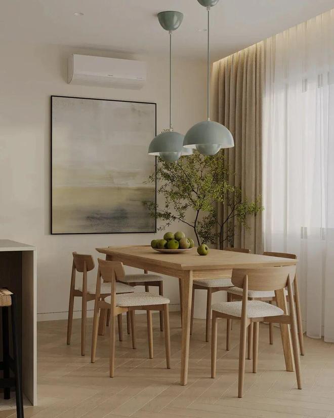 厨房和餐厅无缝衔接,橡木餐桌配浅木色餐椅,和橱柜色调呼应得刚刚好~ 浅蓝色花盆吊灯太戳我了!温柔又不抢眼,不管是清晨的咖啡还是夜晚的晚餐,都自带温馨滤镜,做饭吃饭都成了享受✨