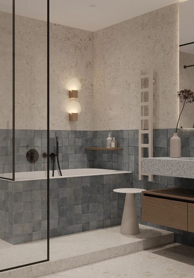 灰蓝色瓷砖包裹着浴缸,石材纹理墙壁 + 水磨石台面,触觉上超有层次~ 柔和灯光 + 极简配饰,没有多余设计,却凭着材质的碰撞,把温暖与简约平衡得恰到好处,泡澡都变香了!