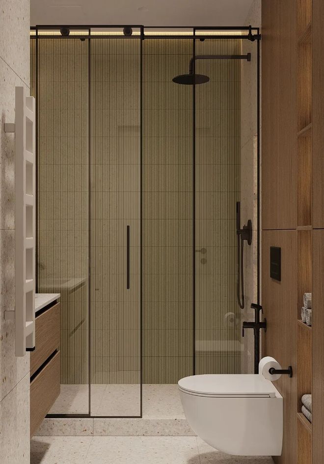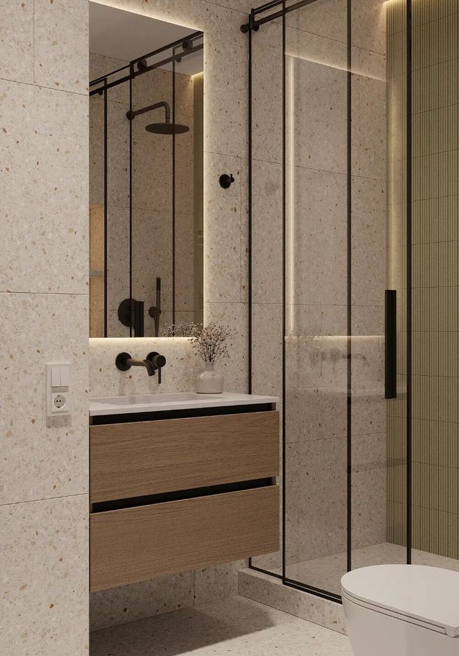 水磨石瓷砖 + 黑色五金件,温柔中带着质感对比~ 背光镜 + 木质盥洗台,触感温润,洗漱都成了放松仪式,每天起床、睡前都能被治愈,这才是精致生活呀!