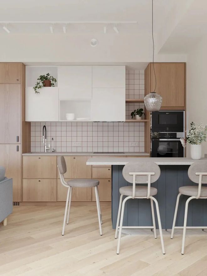 厨房延续了白色与木色的橱柜组合,与网格小砖铺贴的防溅墙相得益彰。中岛被涂上深邃的蓝莓色,注入一抹清凉对比。纤细的吧凳与精巧吊灯,则延续了整体的轻盈感.
