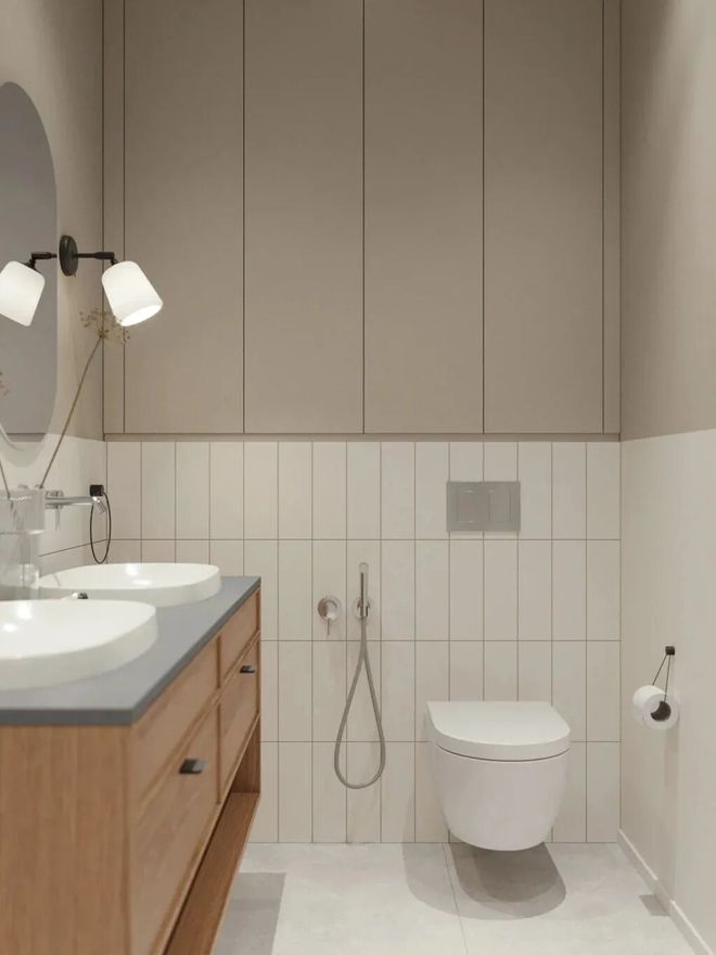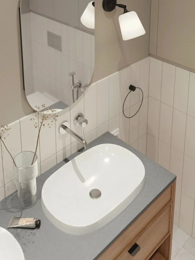 主卫采用竖向铺贴的瓷砖,从视觉上巧妙拉高了空间,让小区域也能拥有开阔感。柔和的米色调贯穿其中,令氛围明亮又舒缓,褪去一天的疲惫。悬浮式橡木浴室柜增添了温暖与质感,用自然的木色稳住整体基调,避免了冷硬感。
