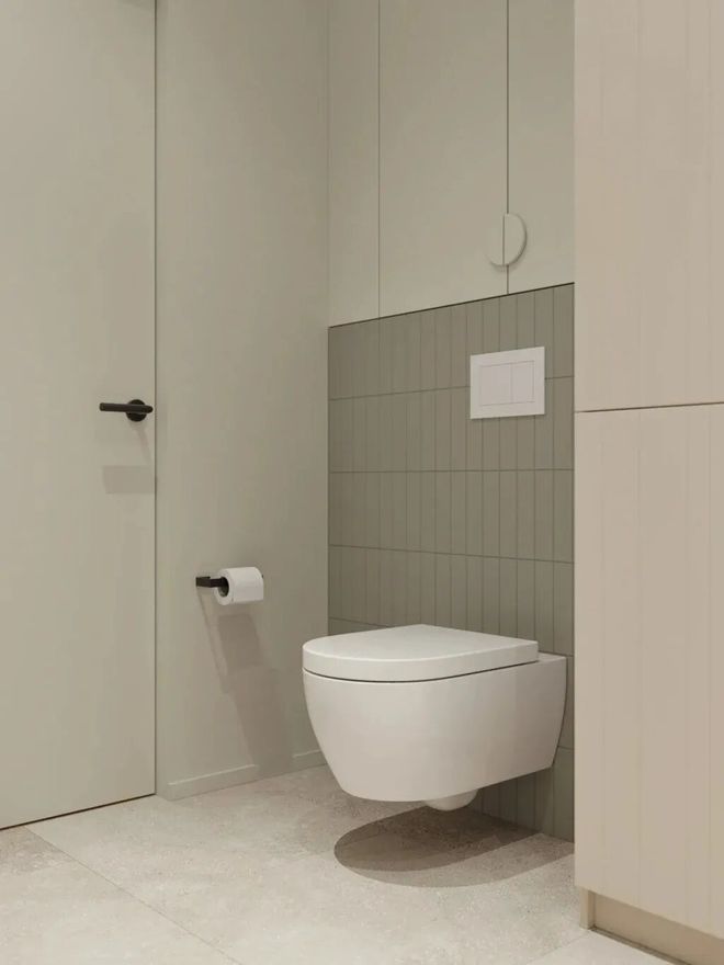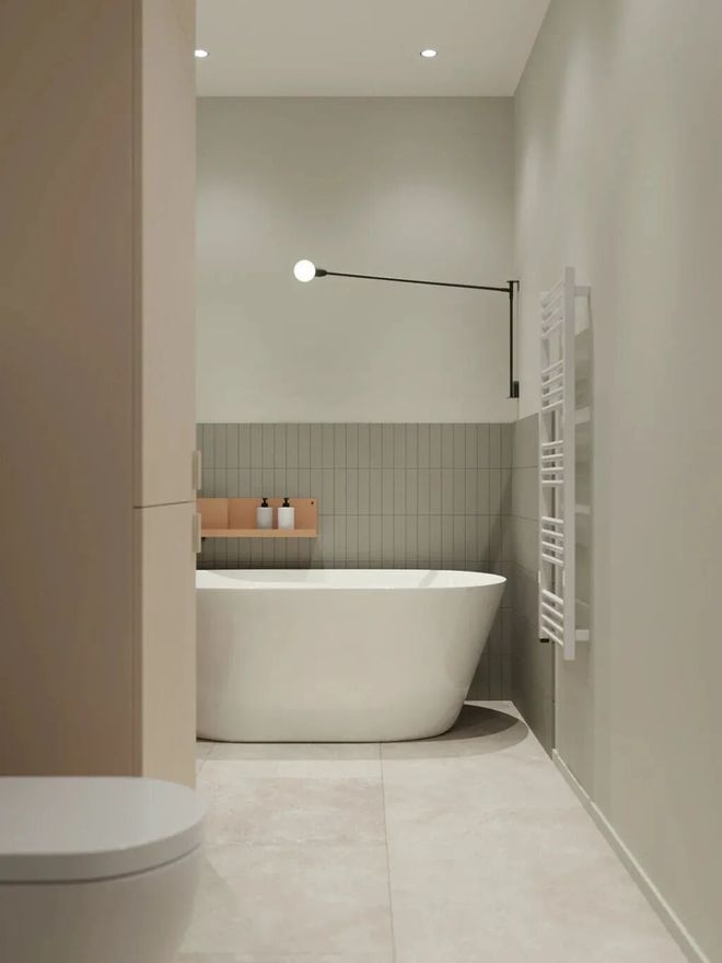 次卫是 “简约而不简单” 的完美范本。浅米色调与灰鼠尾草色瓷砖悄然相遇,营造出低调温柔的氛围。独立浴缸是这里的绝对焦点:造型现代利落,如雕塑般优雅大气,让人一见便心生向往。哑光黑五金增添了恰到好处的对比,却不喧宾夺主;温暖的木制浴室柜与蜜桃色层板则注入了柔和温度,让空间更有层次感。