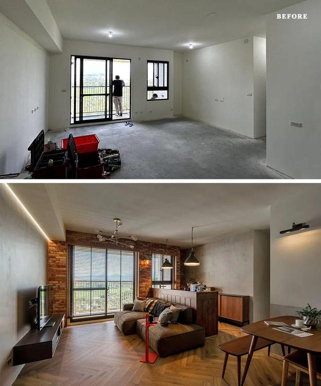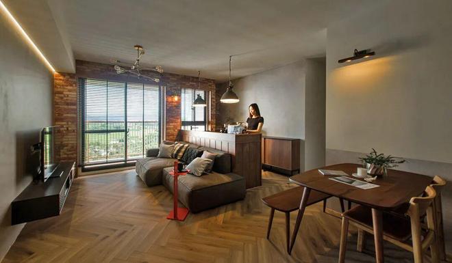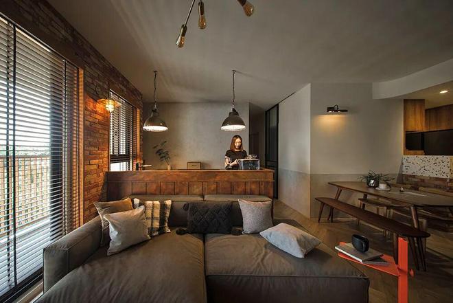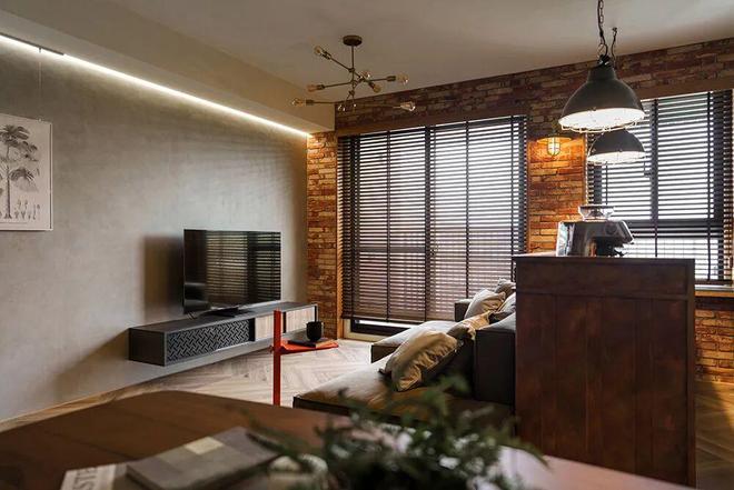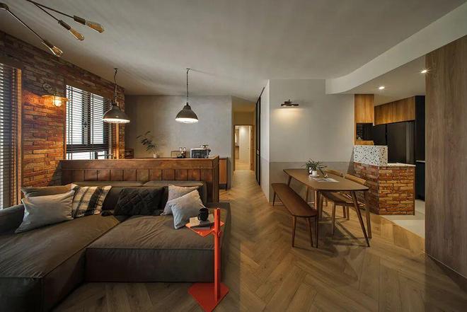 客厅整片牆的红砖砌造,若是选用传统厚砖