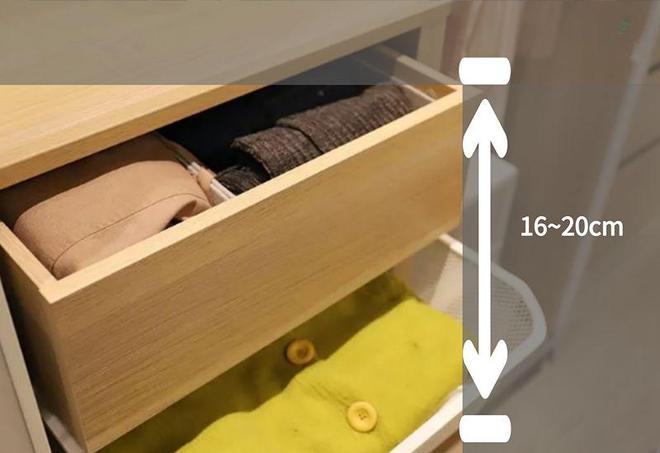 抽屉的高度建议在16-20公分之间,这样的高度非常适合收纳贴身衣物、袜子和手套等小件物品,既方便取用,又能保持衣物的整齐。抽屉的巧妙设计,让小物件收纳更加有序。