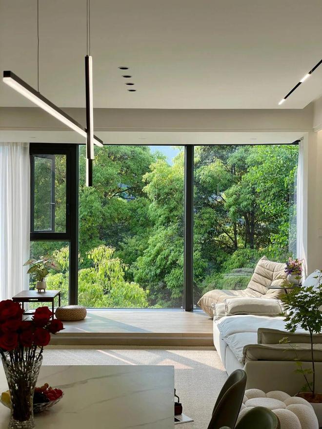 而一整面通透的大玻璃窗,恰好契合了现代人对“简约高级感”的追求,并且这份颜值,还会随着光线与季节不断变化,从而让家呈现出不同的居住氛围感。