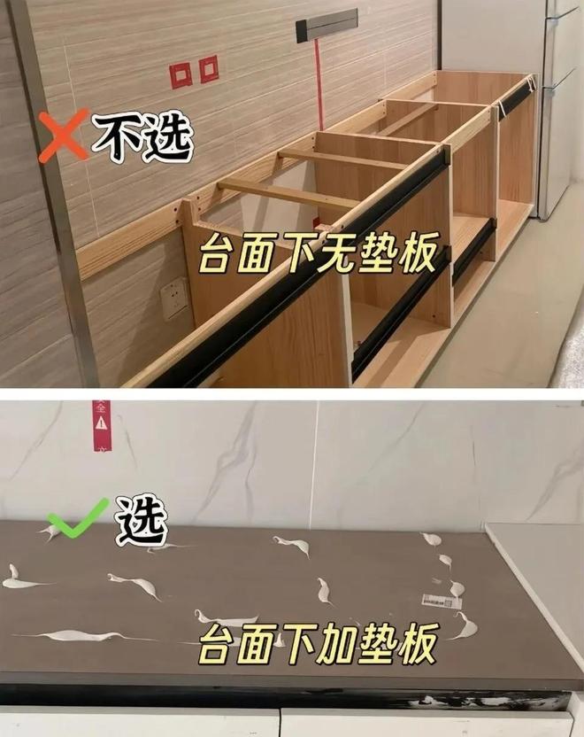 一旦发现,橱柜商家没有给台面用整板做衬板的,都要及时做沟通,因为后期很容易出问题的。