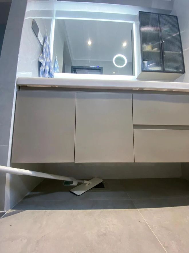 所以,我们不妨给浴室柜的下水做“墙排设计”,并增加一个地漏检修口,既方便了地面排水,也方便了后期维修疏通。
