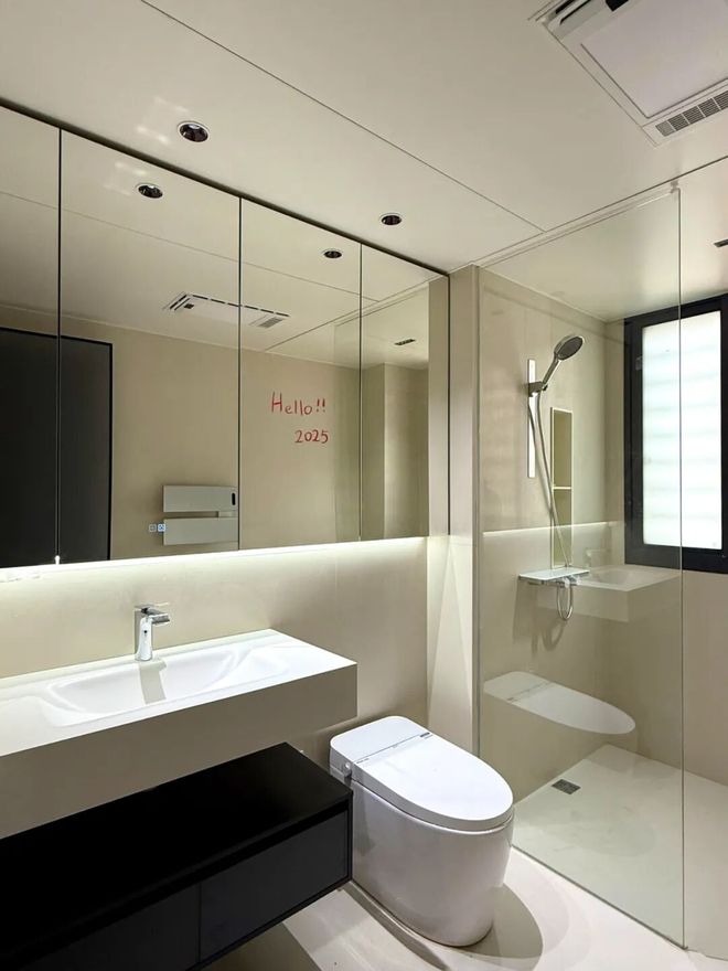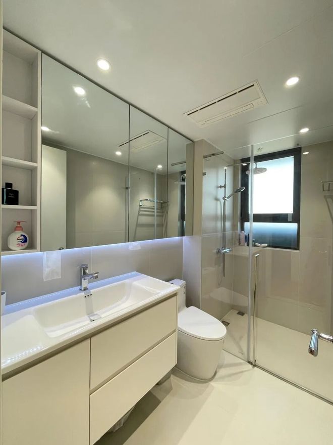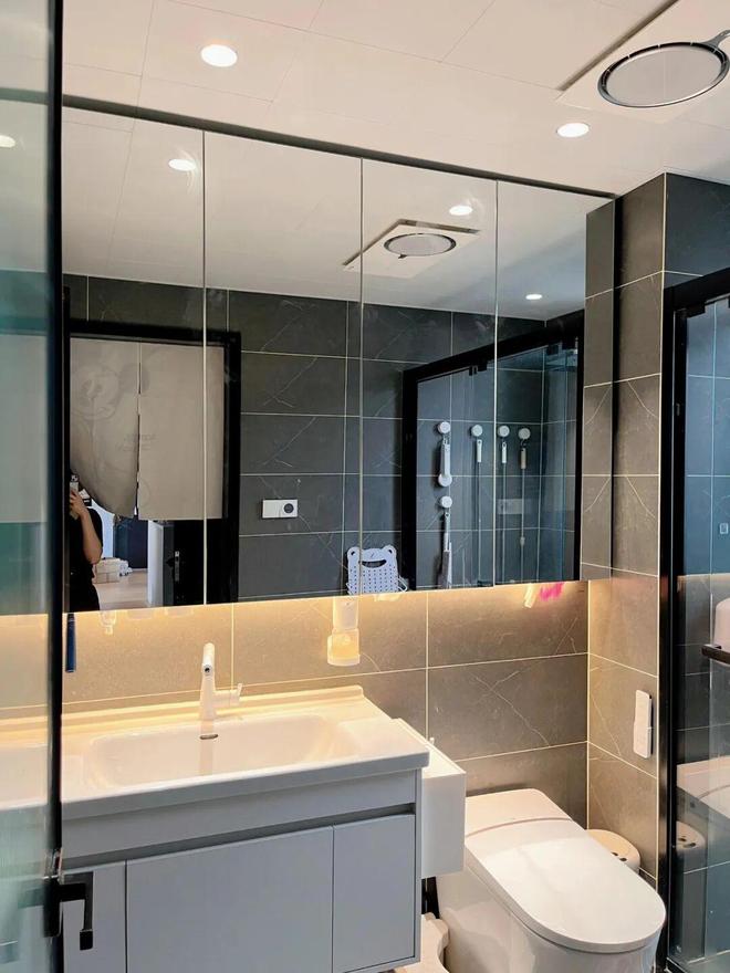 所以,在镜柜和马桶区连在一起的情况下,一定要给镜柜做“延伸设计”,最大化提升空间的收纳力。